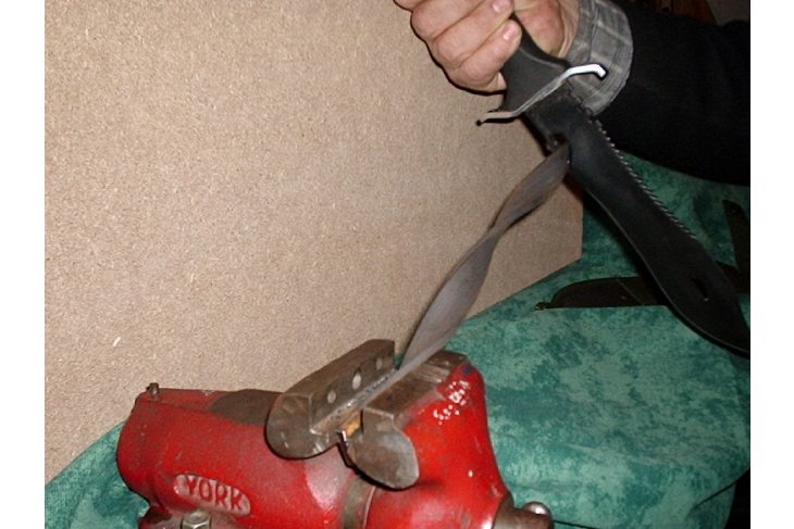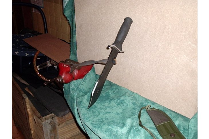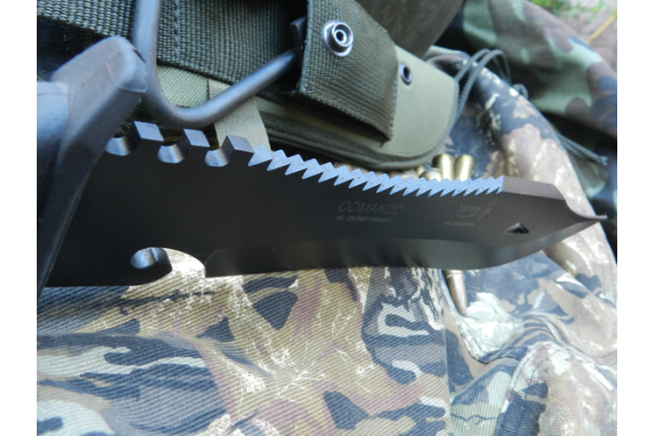 3)Serrucho del lomo: Con el mismo en forma de dientede sierra convencional,puede aserrarce,utilizando el gancho como punto de apoyo sobre la parte delantera de la hoja,todo tipo de metales y maderas,inclusive hierros ,sobrepasó con éxito el aserrado de una barra de 25 mmm de diámetro de hierro dulce,obviamente la velocidad de corte no se puede comparar con la de una sierra convencional pero la perfomance esta disponible para el caso de una necesidad