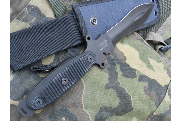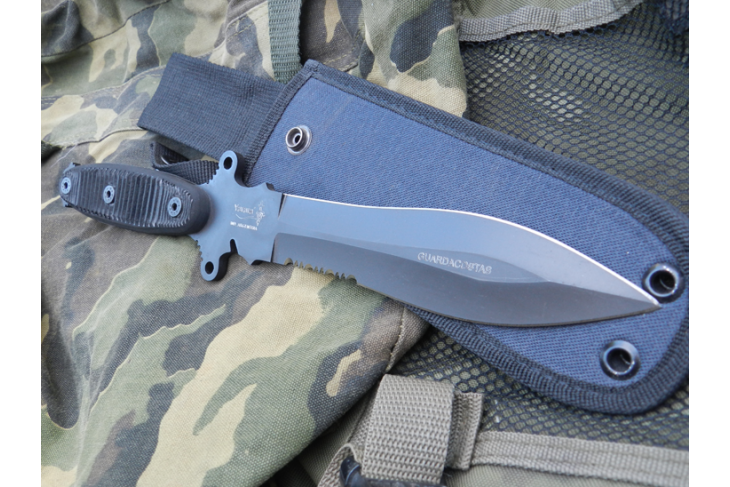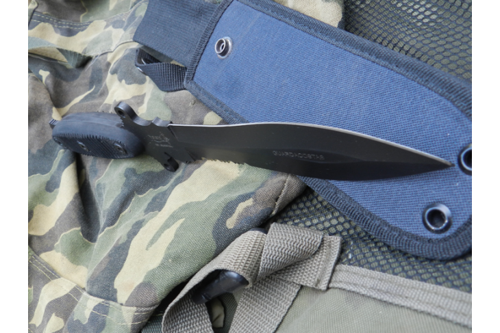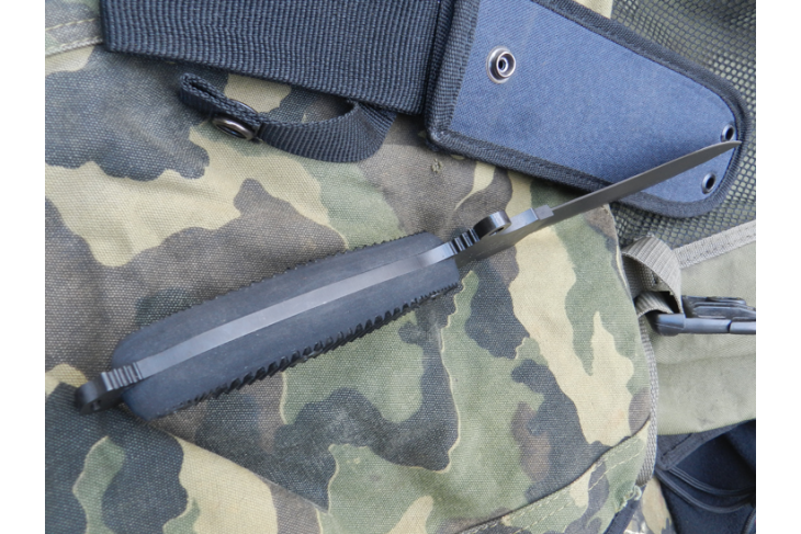 Daga de hoja enteriza con doble filo acorazonado y diente de sierra  tipo Spyderco en una de sus caras, con excelentes prestaciones en actividades relativas a la nautica, construida en acero SAE 6150, acero al carbono aleado al Cromo Vanadio de origen Aleman certificado, dureza final 57/58 Rocwell C