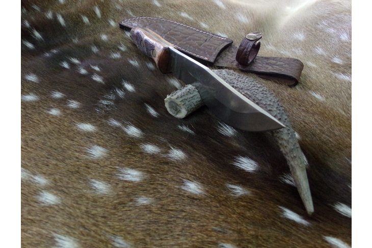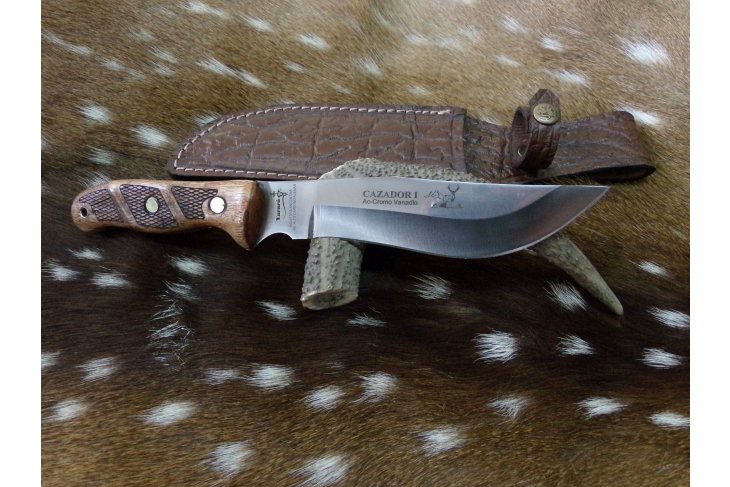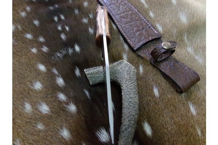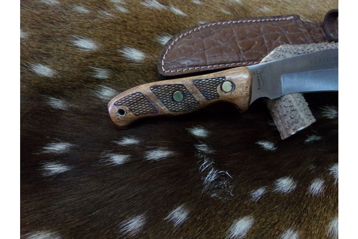 Robusto cuchillo enterizo con filo doble concavo , lomo entero, apto golpe, en acero al carbono aleado al cromo-vanadio aleacion SAE  6150 , origen Aleman (Region Solingen ) Certificado Dureza 56/58 Rocwell C Terminacion   pulido mate