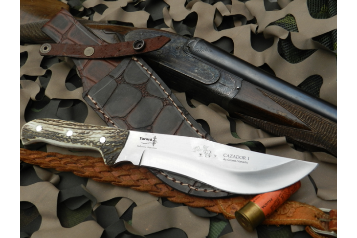 Robusto cuchillo enterizo con filo doble concavo , lomo entero, apto golpe, en acero al carbono aleado al cromo-vanadio aleacion SAE  6150 , origen Aleman (Region Solingen ) Certificado Dureza 56/58 Rocwell C Terminacion   pulido mate