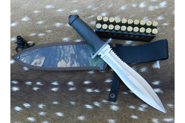 Cuchillo de gran porte y liviano, con hoja acorazonada y doble filo en \" S \", posee un dentado en uno de sus lomos y muesca corta alambres en el otro.