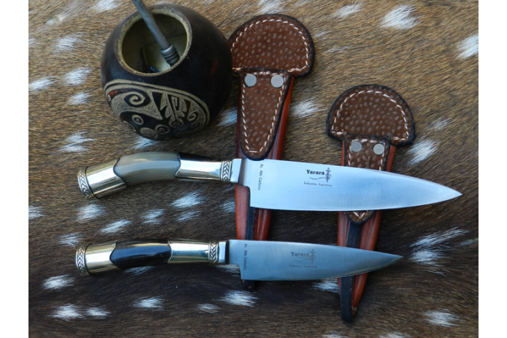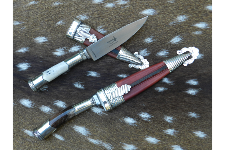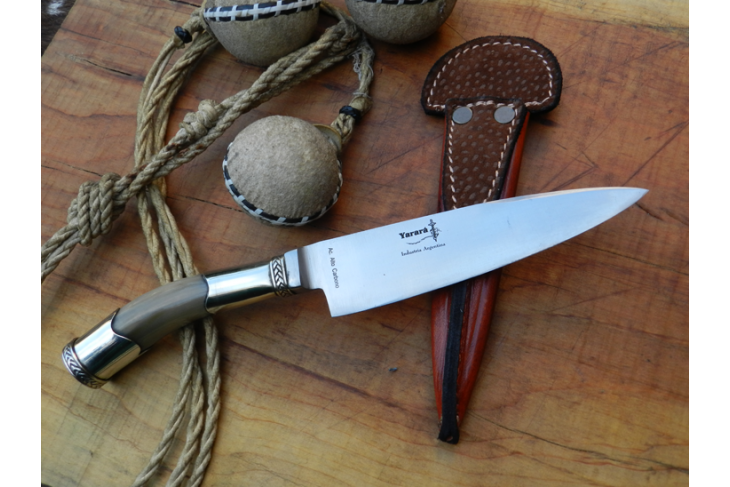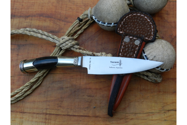 Se provee con su correspondiente vaina reforzada de cuero cocida a mano curtido vegetal y estuche/caja