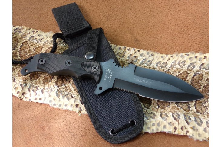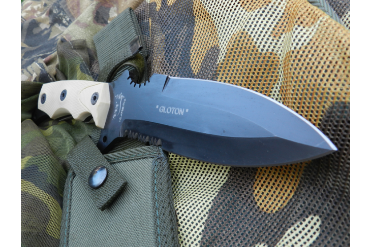 Robusto cuchillo construido en una sola pieza con hoja doble filo doble concavo, con gran capacidad de corte