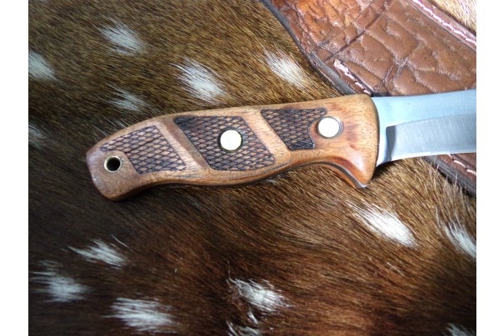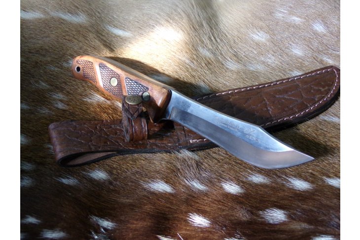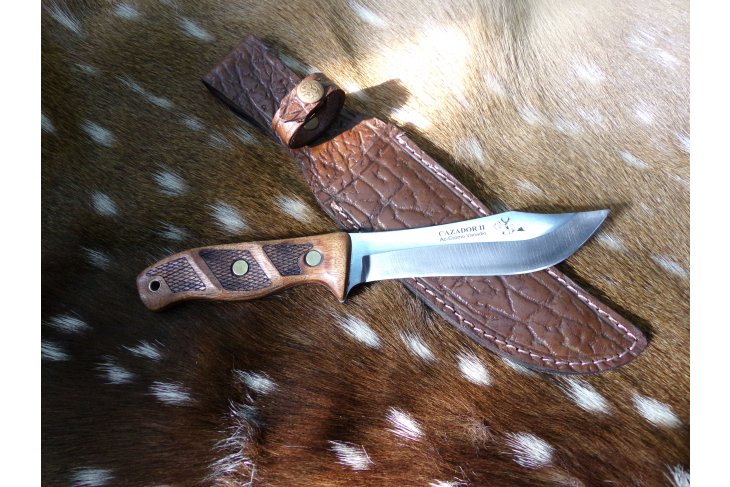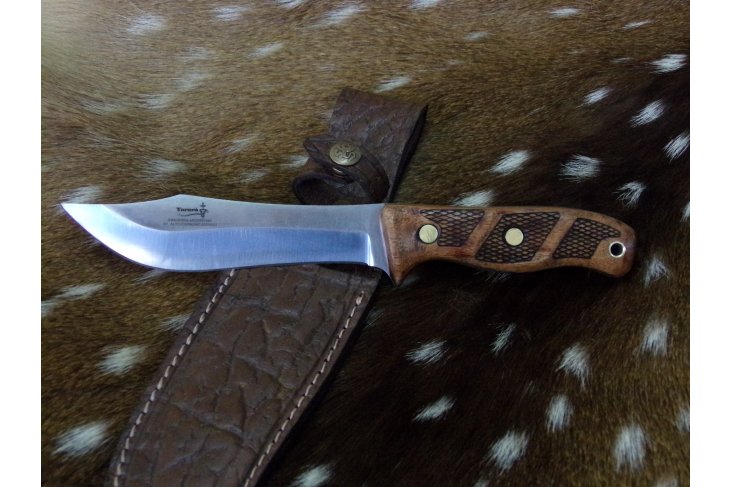 Robusto cuchillo enterizo con filo doble concavo , lomo entero, apto golpe, en acero al carbono aleado al cromo-vanadio aleacion SAE  6150 , origen Aleman (Region Solingen ) Certificado Dureza 56/58 Rocwell C Terminacion   pulido mate