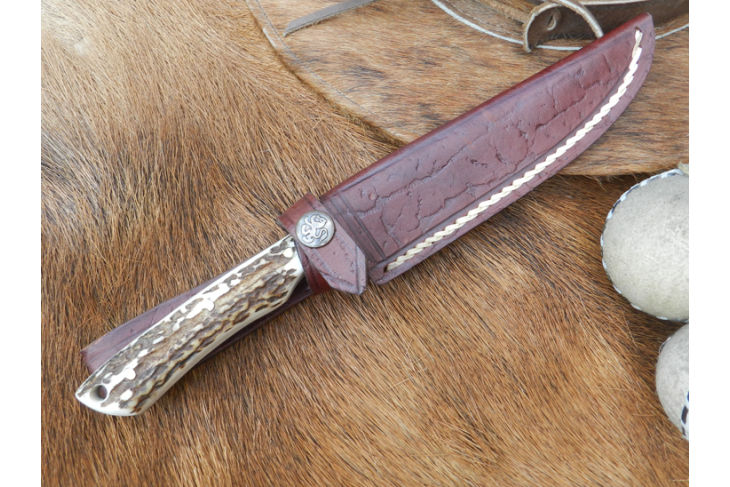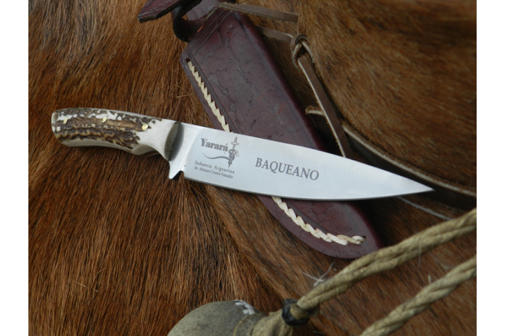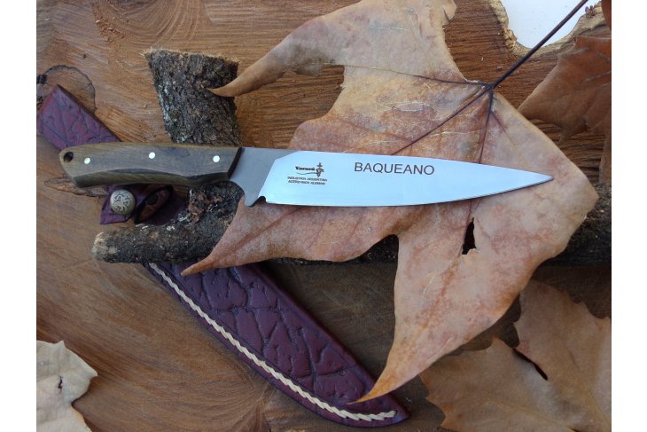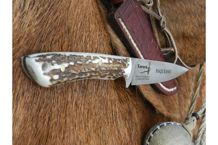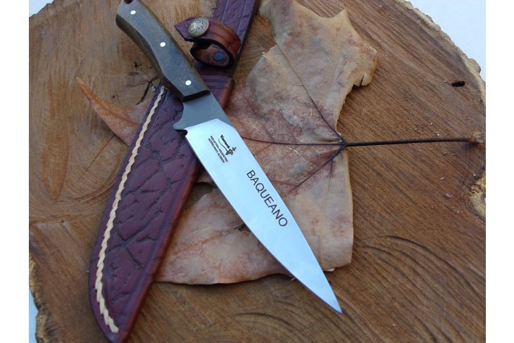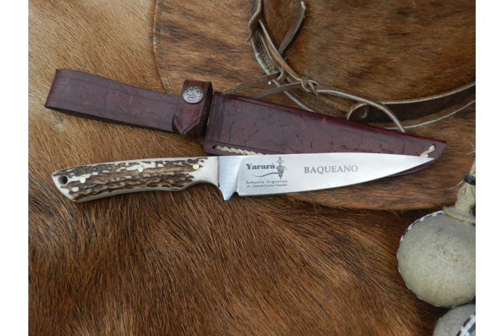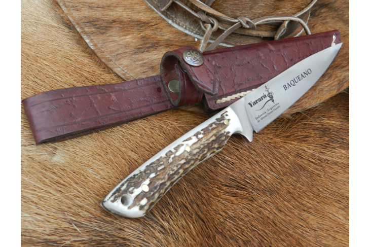 Se provee con vaina de cuero vacuno curtido vegetal hecha a mano y cosida con tientos de potro