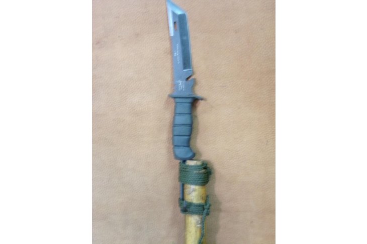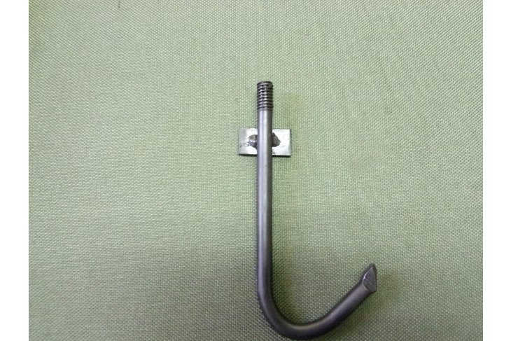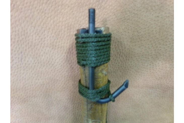 El gancho se puede fijar invertido en una vara de madera biselada(muesca en la parte superior para que se apoye las aletas soldadas del gancho ) y se transforma en lanza