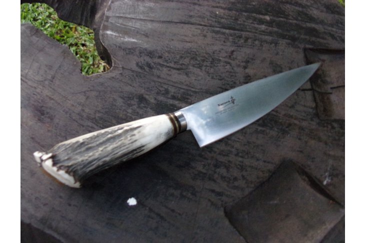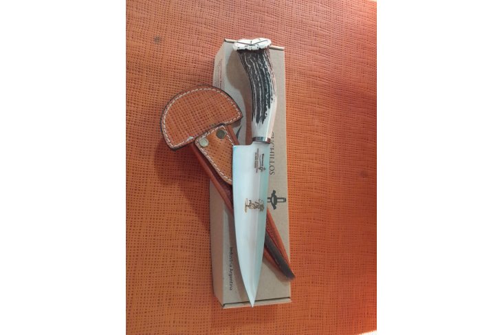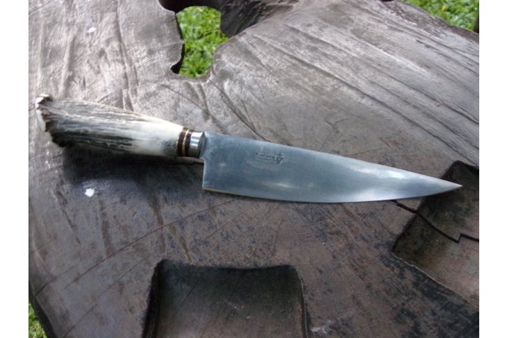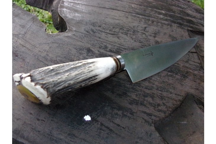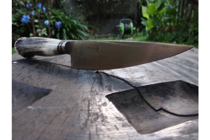 Cuchillo estilo criollo construido en una sola pieza (Hoja y espiga) en acero quirurgico de origen aleman 440 C dureza 56 Rockwel, terminacion pulido mate con boton postizo