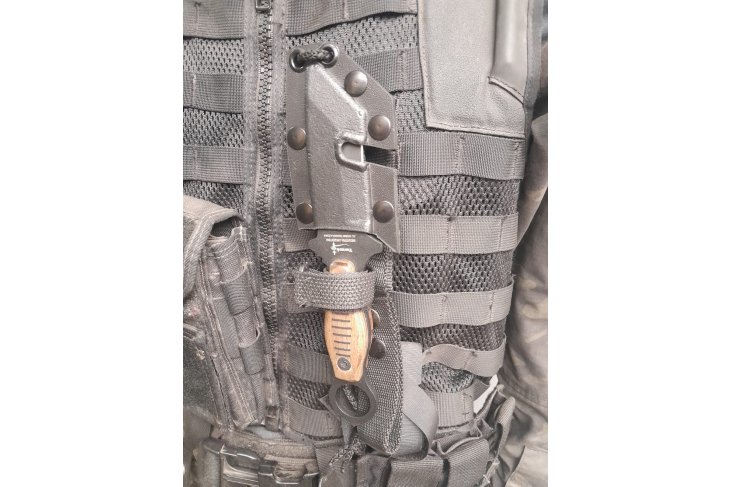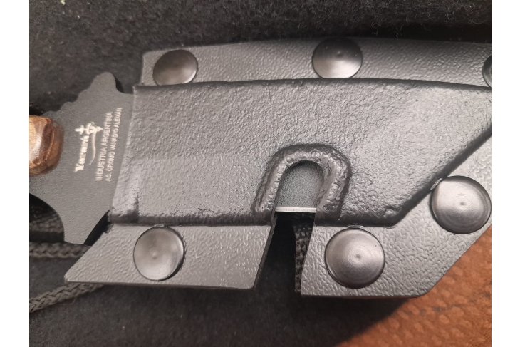 POSEE UNA VAINA RIGIDA ESPECIAL QUE PERMITE EL CORTE RAPIDO DE CUERDAS Y CORREAJES CON EL CUCHILLO PUESTO, SIN TENER QUE SACARLO DE LA VAINA.